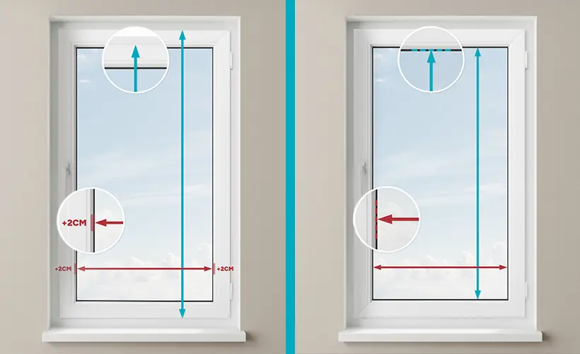 For invasive pleated blinds installed with drilling, the width measurement works differently. You don’t just measure the glass—you also include the black rubber gasket surrounding it. No extra centimeters are added to this measurement—just enter the exact dimension when placing your order.