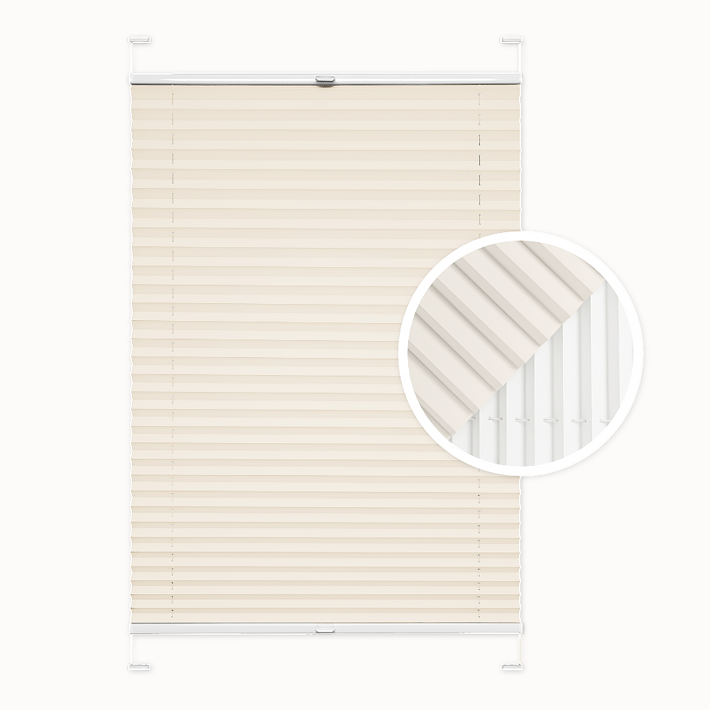 Premium blackout pleated blind. Color: Cream. Installation with or without drilling. Custom made. Width: 30–130 cm. Height: 40–230 cm. Blackout: 100%.