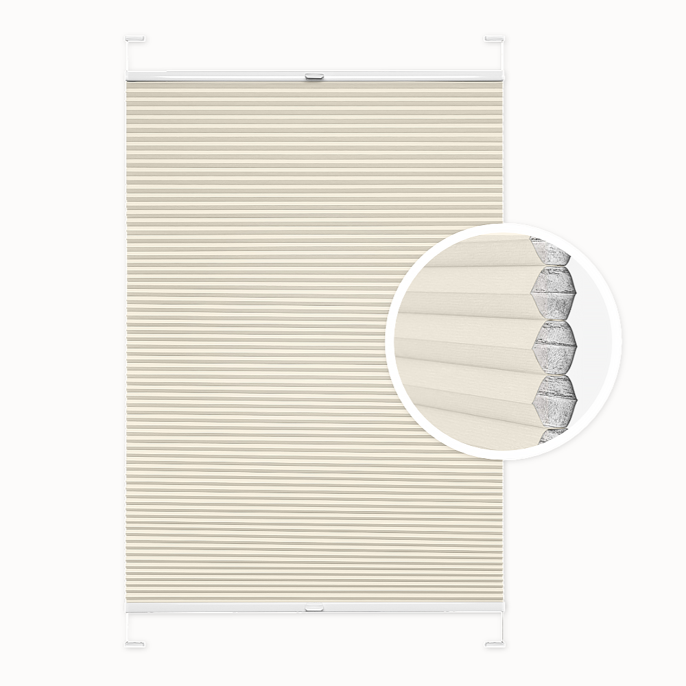 Honeycomb pleated blind. Color: Beige. Installation with or without drilling. Custom made. Width: 30–130 cm. Height: 40–230 cm. Blackout: 100%.