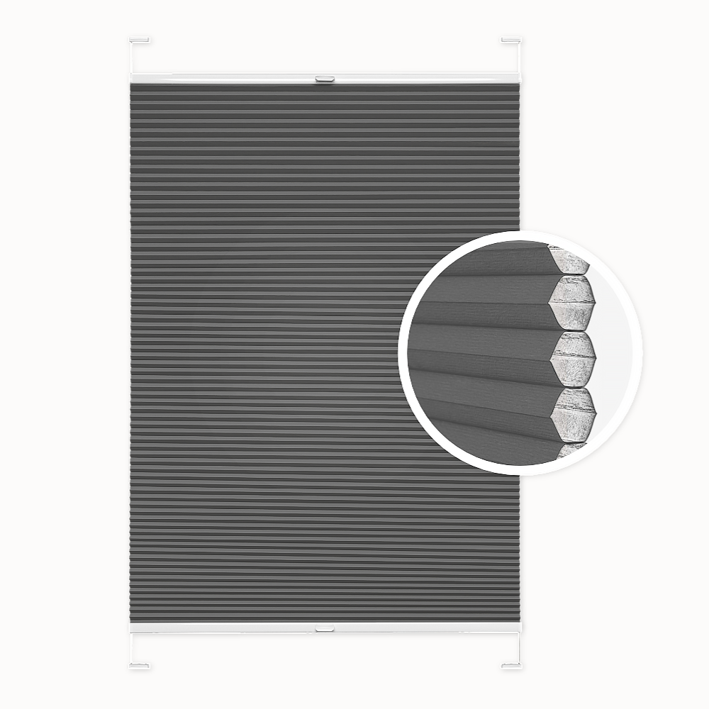 Honeycomb pleated blind. Color: Steel. Installation with or without drilling. Custom made. Width: 30–130 cm. Height: 40–230 cm. Blackout: 100%.