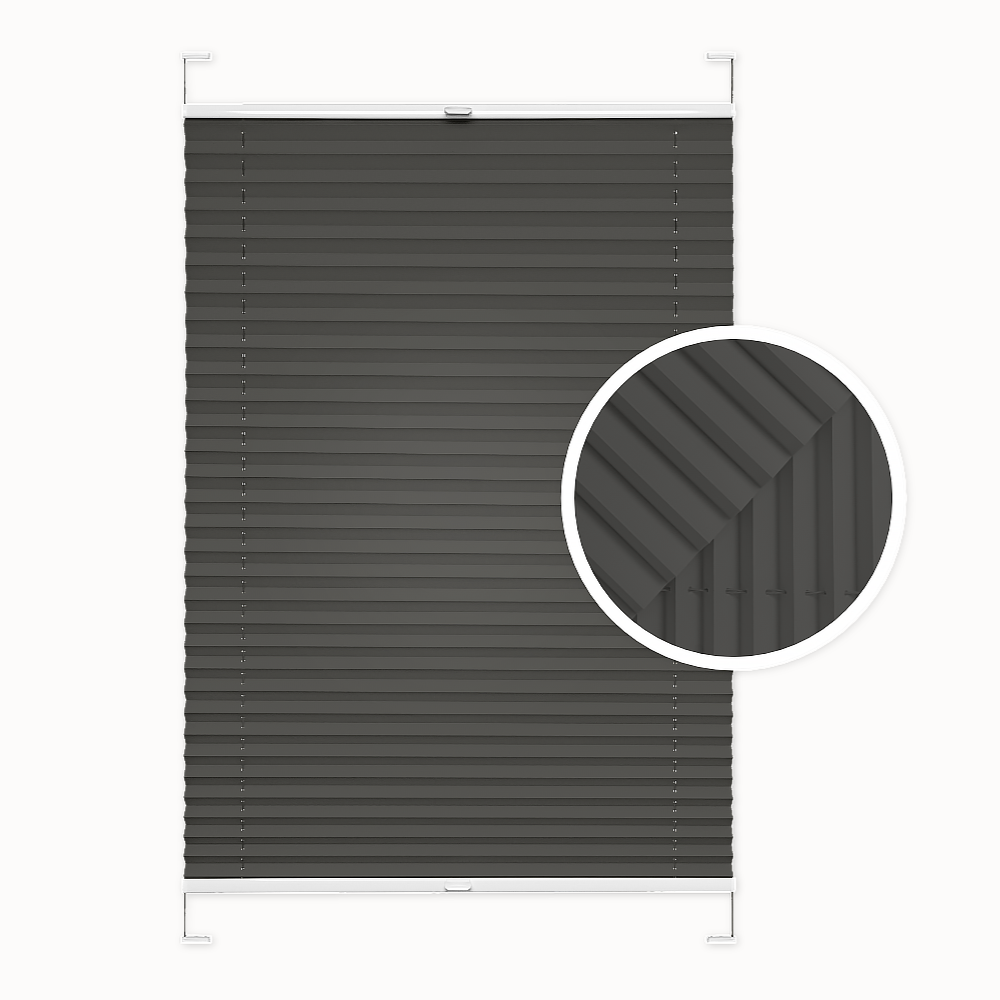 Pleated blind. Color: Anthracite. Installation with or without drilling. Custom-made. Width: 30–140 cm. Height: 40–230 cm. Blackout level: approx. 50%