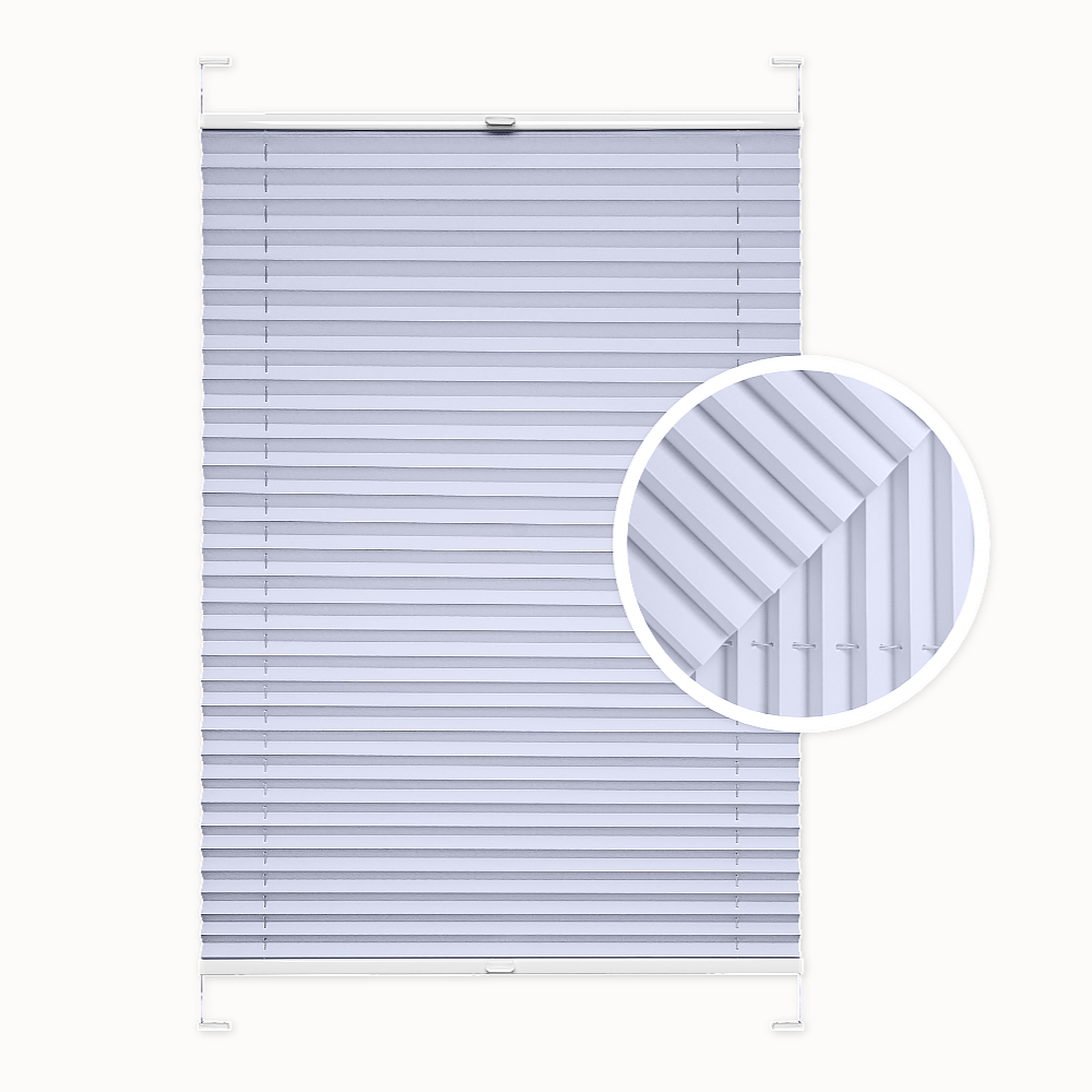 Pleated blind. Color: Dove Grey. Installation with or without drilling. Custom-made. Width: 30–140 cm. Height: 40–230 cm. Blackout level: approx. 50%