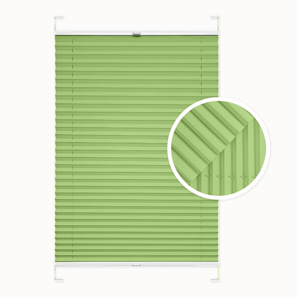 Pleated blind. Color: Pistachio. Installation with or without drilling. Custom-made. Width: 30–140 cm. Height: 40–230 cm. Blackout level: approx. 50%