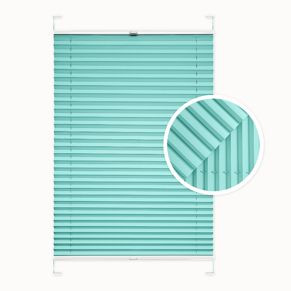 Pleated blind. Color: Turquoise Blue. Installation with or without drilling. Custom-made. Width: 30–140 cm. Height: 40–230 cm. Blackout level: approx. 50%