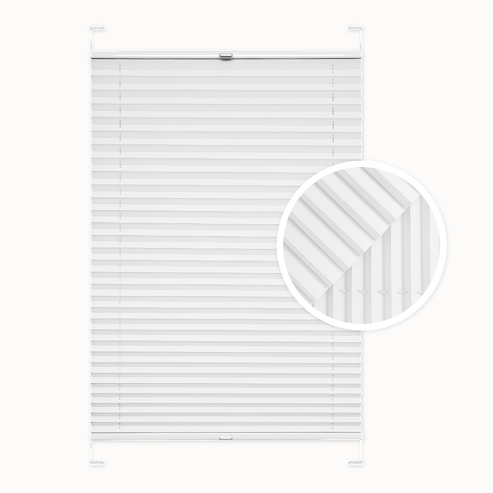 Pleated blind. Color: white. Installation with or without drilling. Custom-made. Width: 30–140 cm. Height: 40–230 cm. Blackout level: approx. 50%