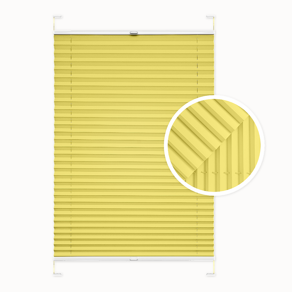 Pleated blind. Color: Yellow. Installation with or without drilling. Custom-made. Width: 30–140 cm. Height: 40–230 cm. Blackout level: approx. 50%
