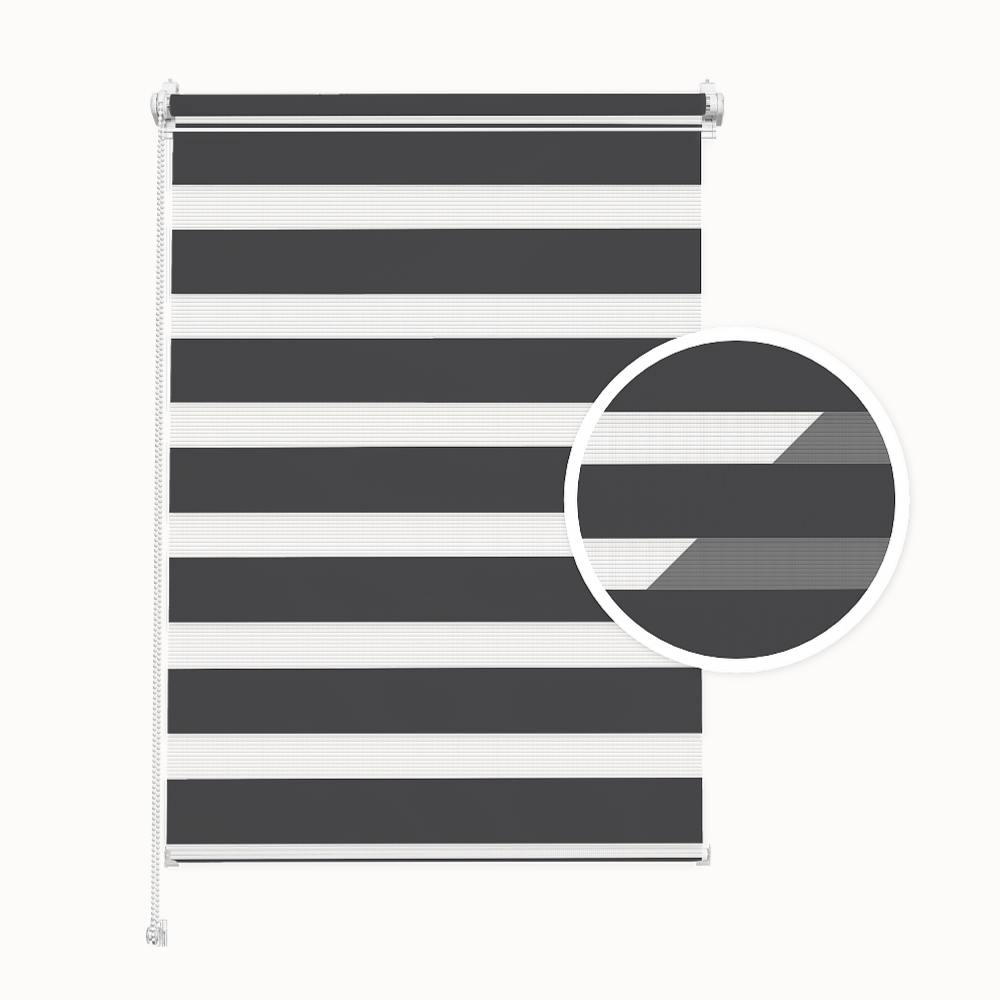 Day and Night Blind. Color: Anthracite. No-drill installation. Custom-made. Width: 30–150 cm. Height: 120, 150 or 220 cm. Darkening: approx. 50%.