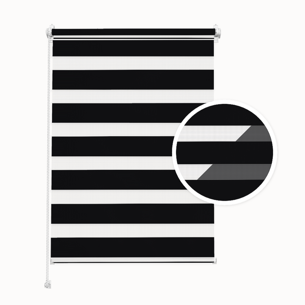 Day and Night Blind. Color: Black. No-drill installation. Custom-made. Width: 30–150 cm. Height: 120, 150 or 220 cm. Darkening: approx. 50%.