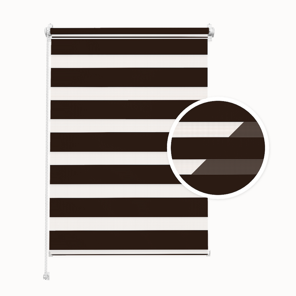 Day and Night Blind. Color: Brown. No-drill installation. Custom-made. Width: 30–150 cm. Height: 120, 150 or 220 cm. Darkening: approx. 50%.
