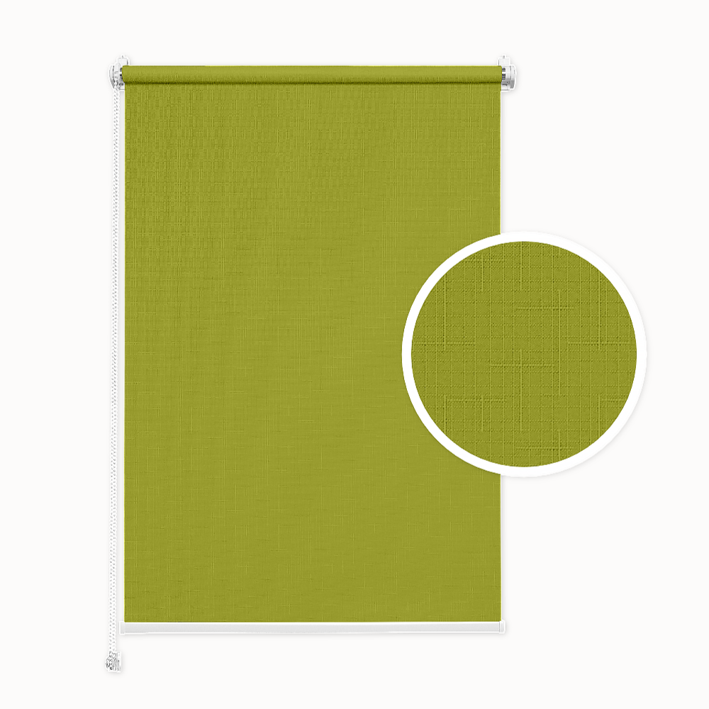 Standard (classic) roller blind. Color: Yellow-Green. Tool-free installation. Made to measure. Width: 30–150 cm. Height: 150 or 220 cm. Light filtering: approx. 50%.