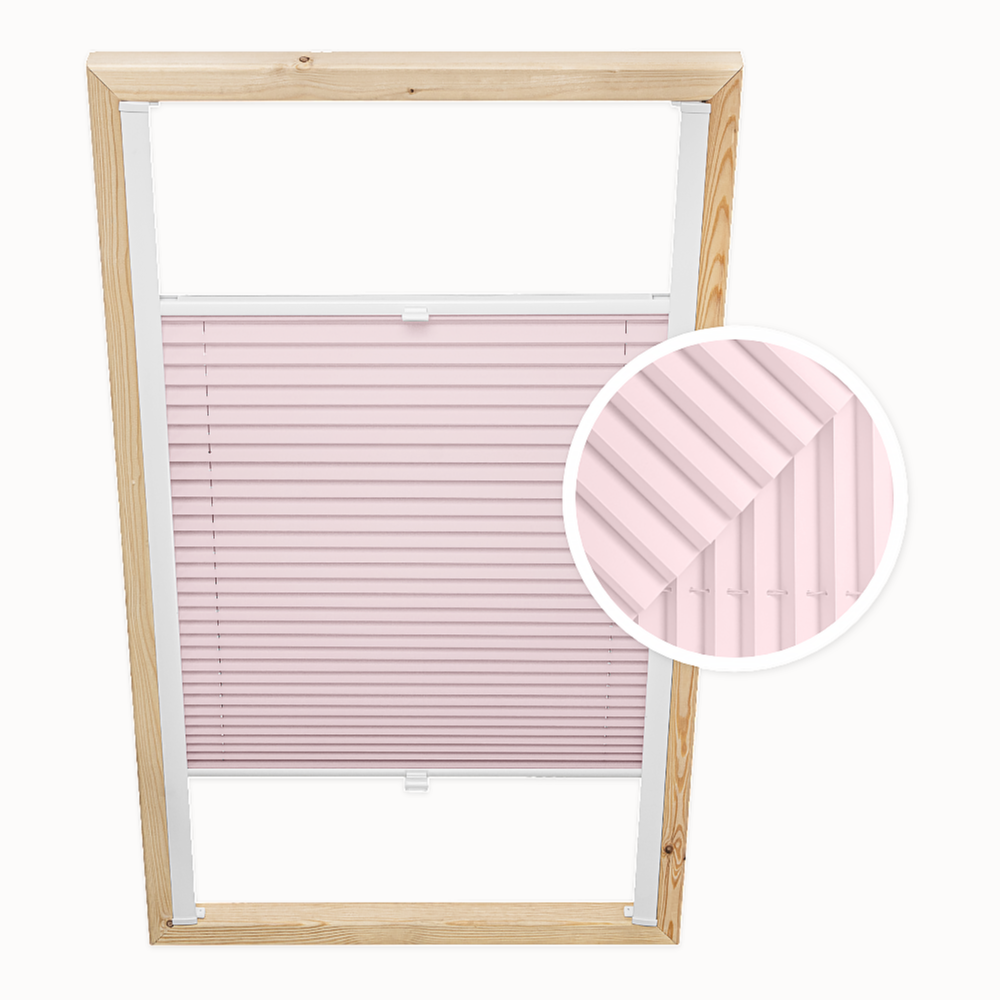 Custom skylight pleated blind. Color Pink. Screw-mounted installation. Width: 30-120 cm. Height: 30-150 cm. Blackout: approx. 50%.